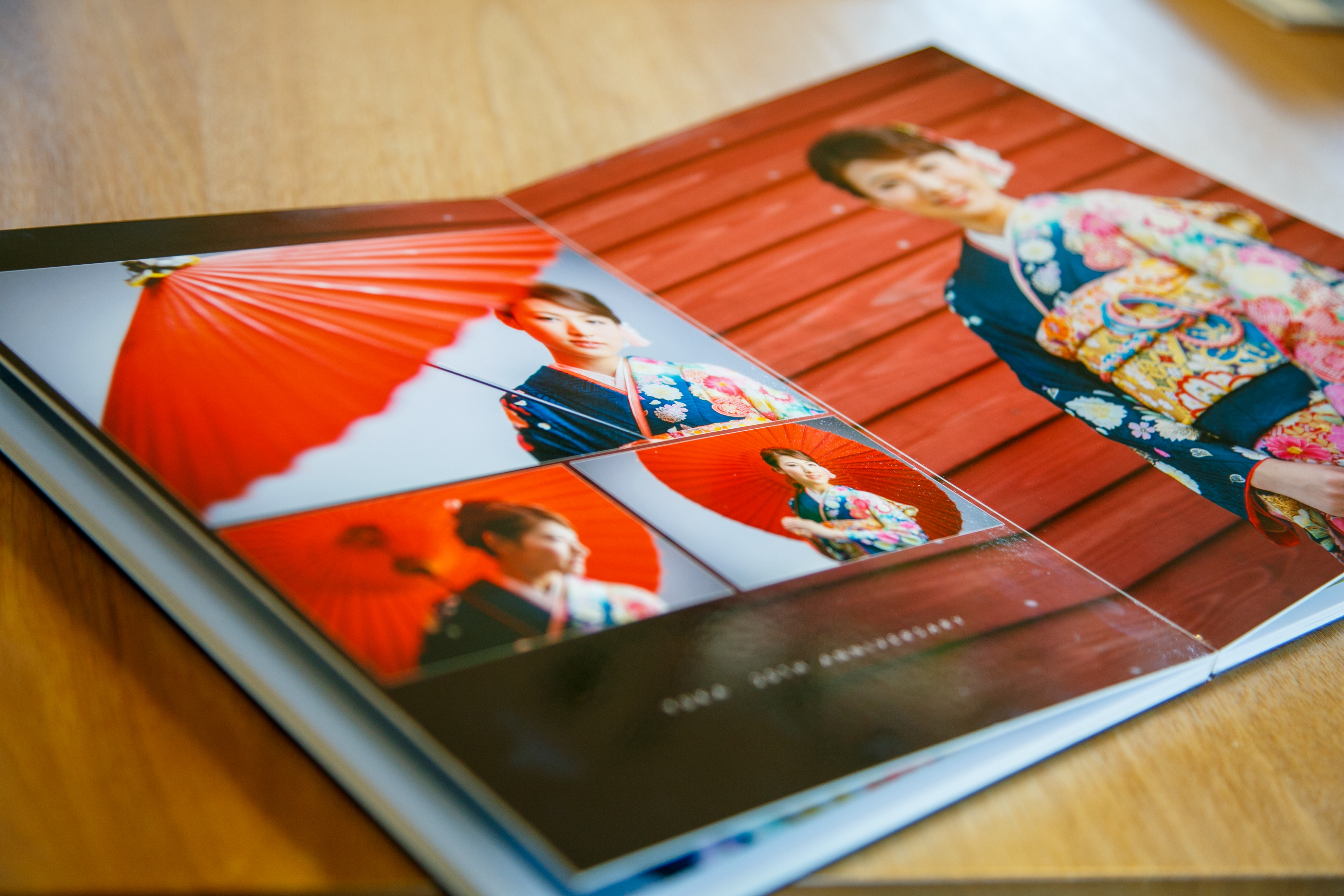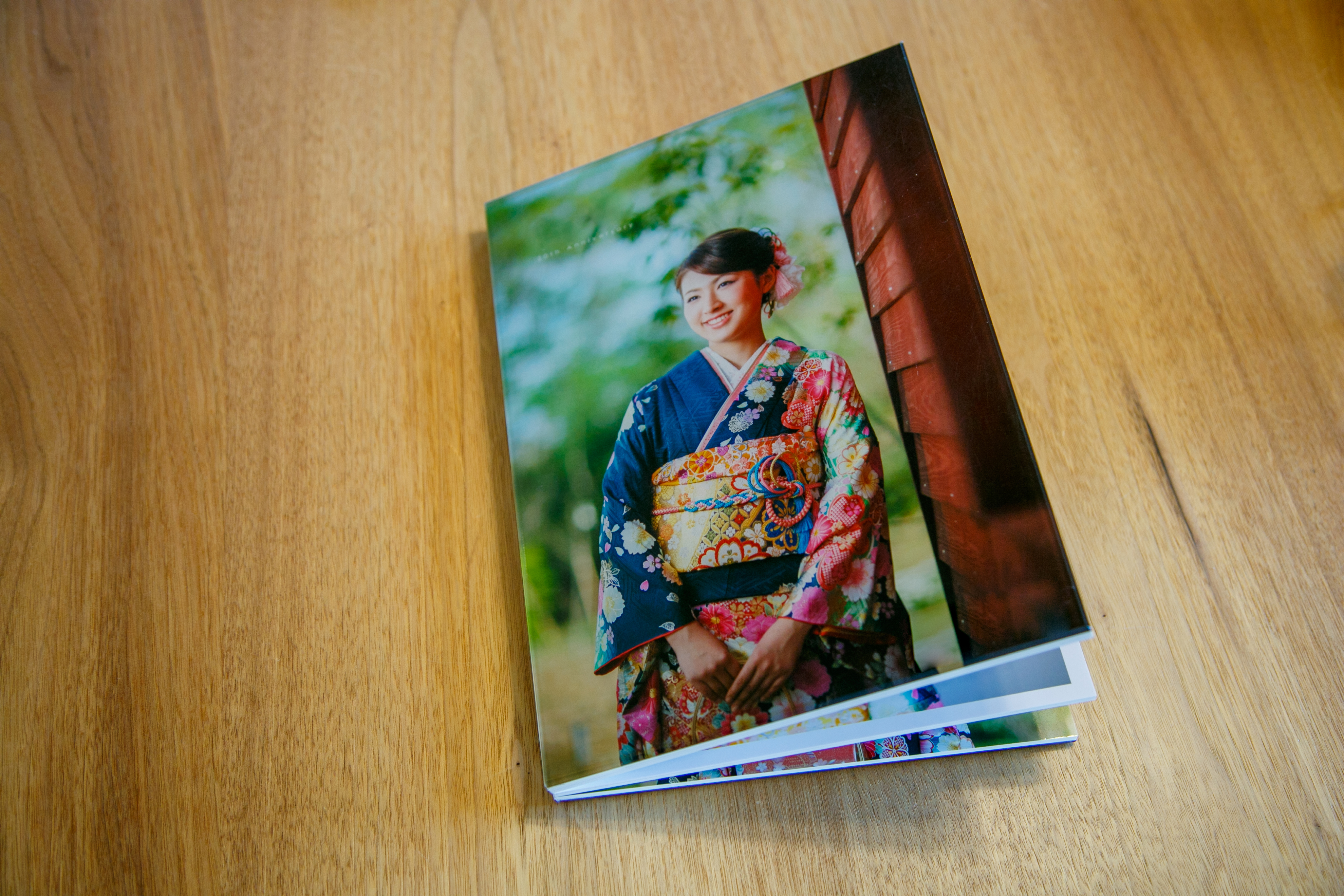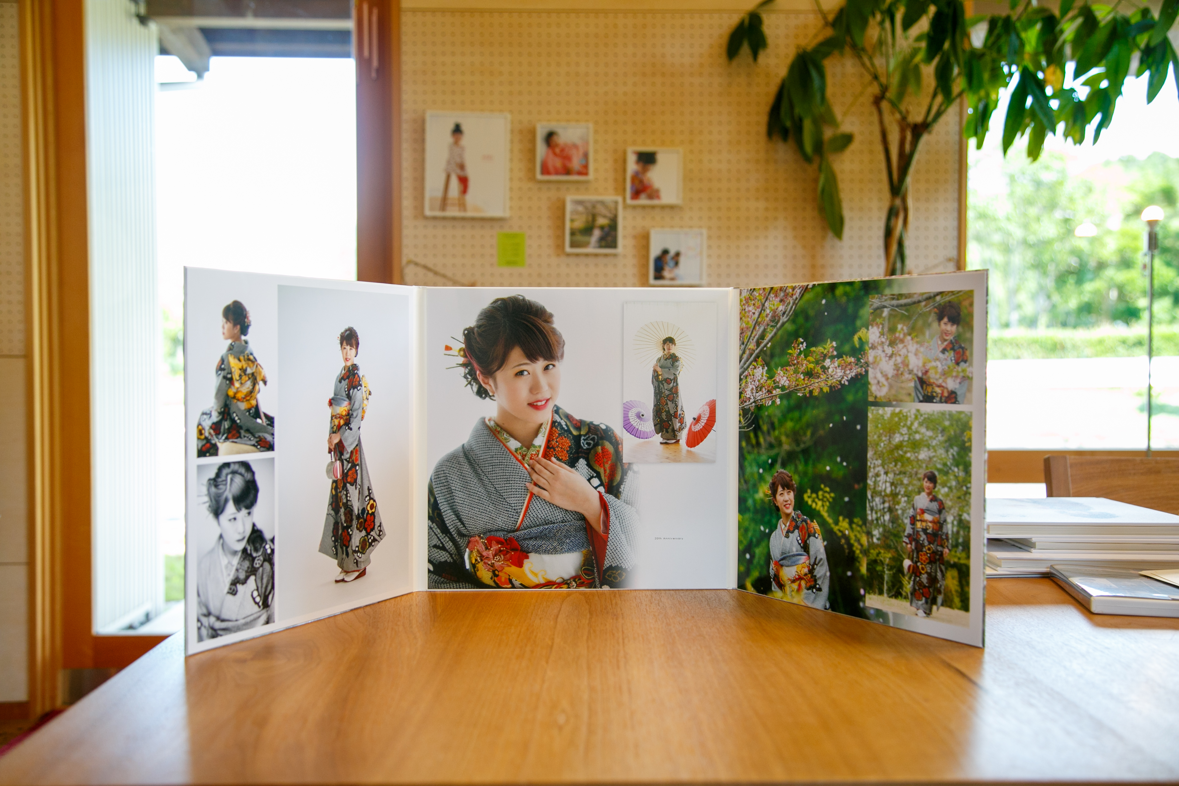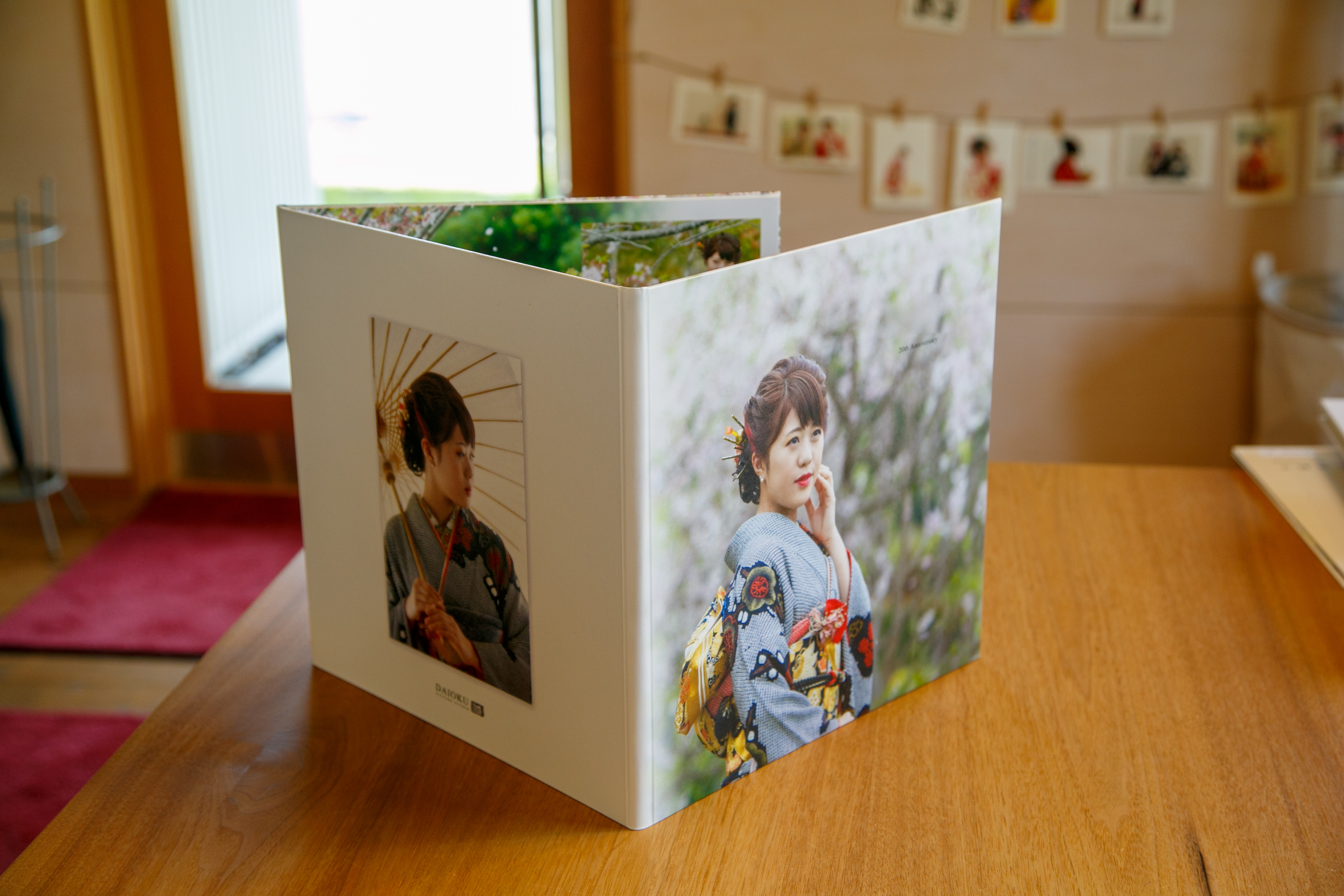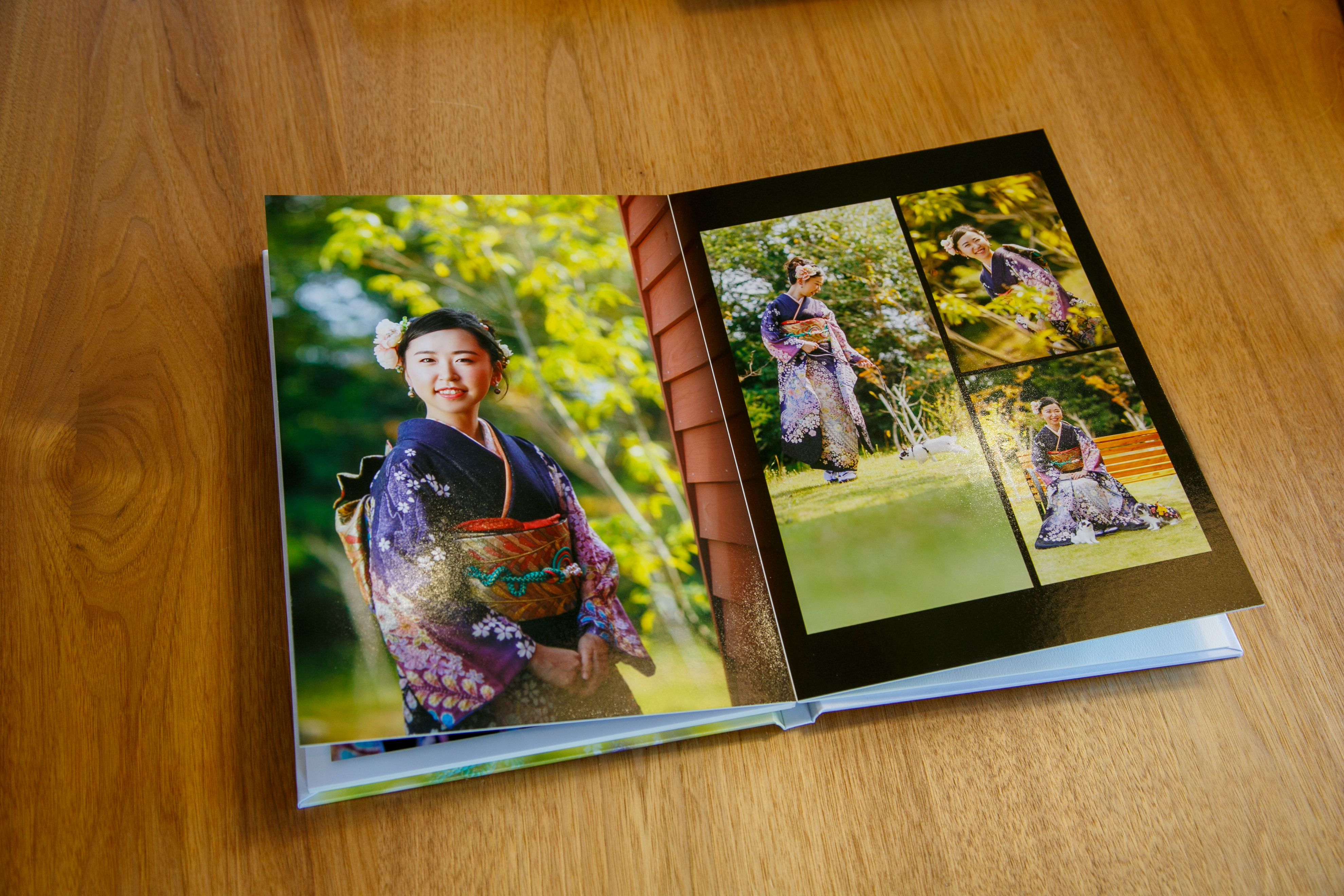 見開きデザインアルバム1冊と、全データ、そしてプレゼント用として額を2枚セットしました。