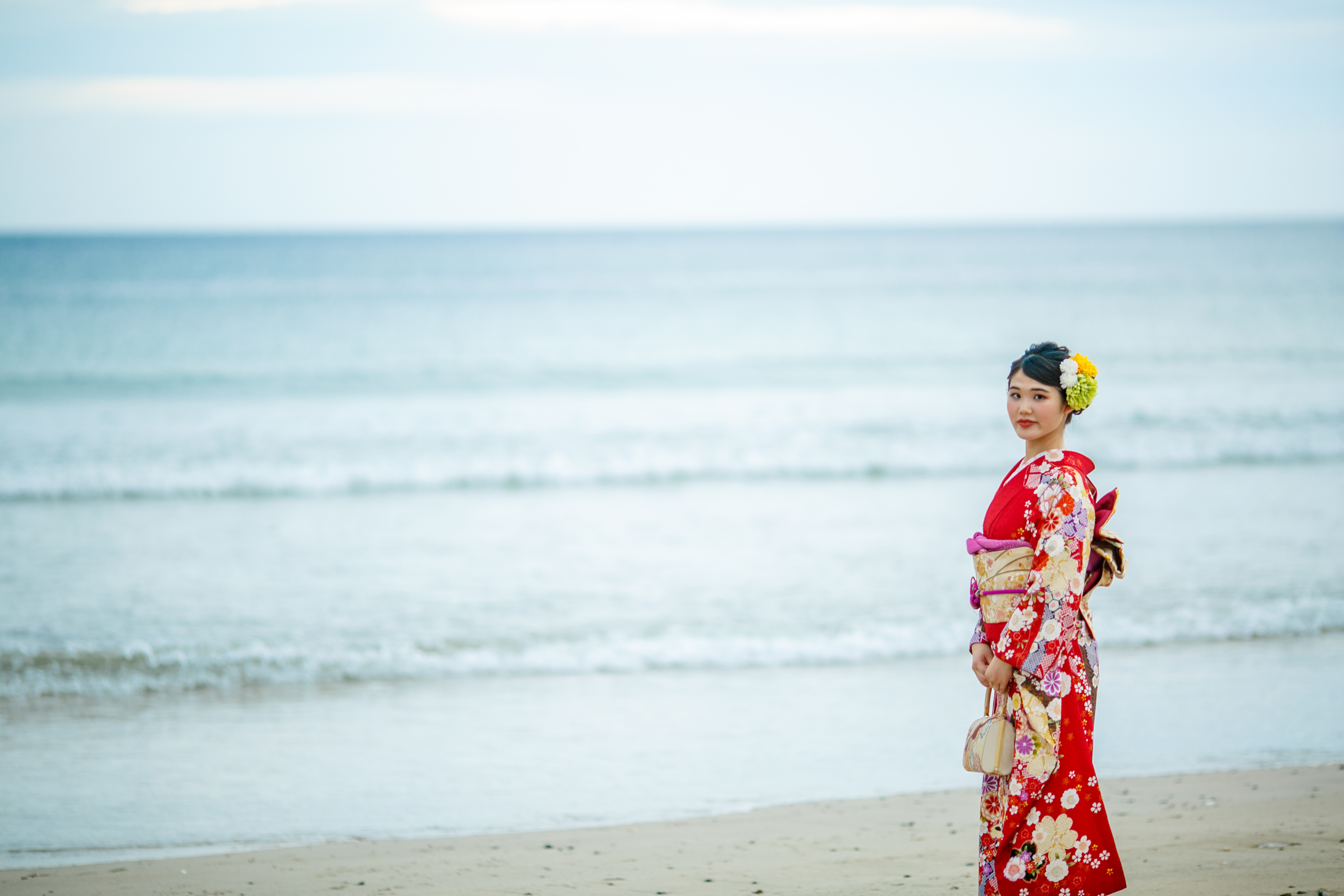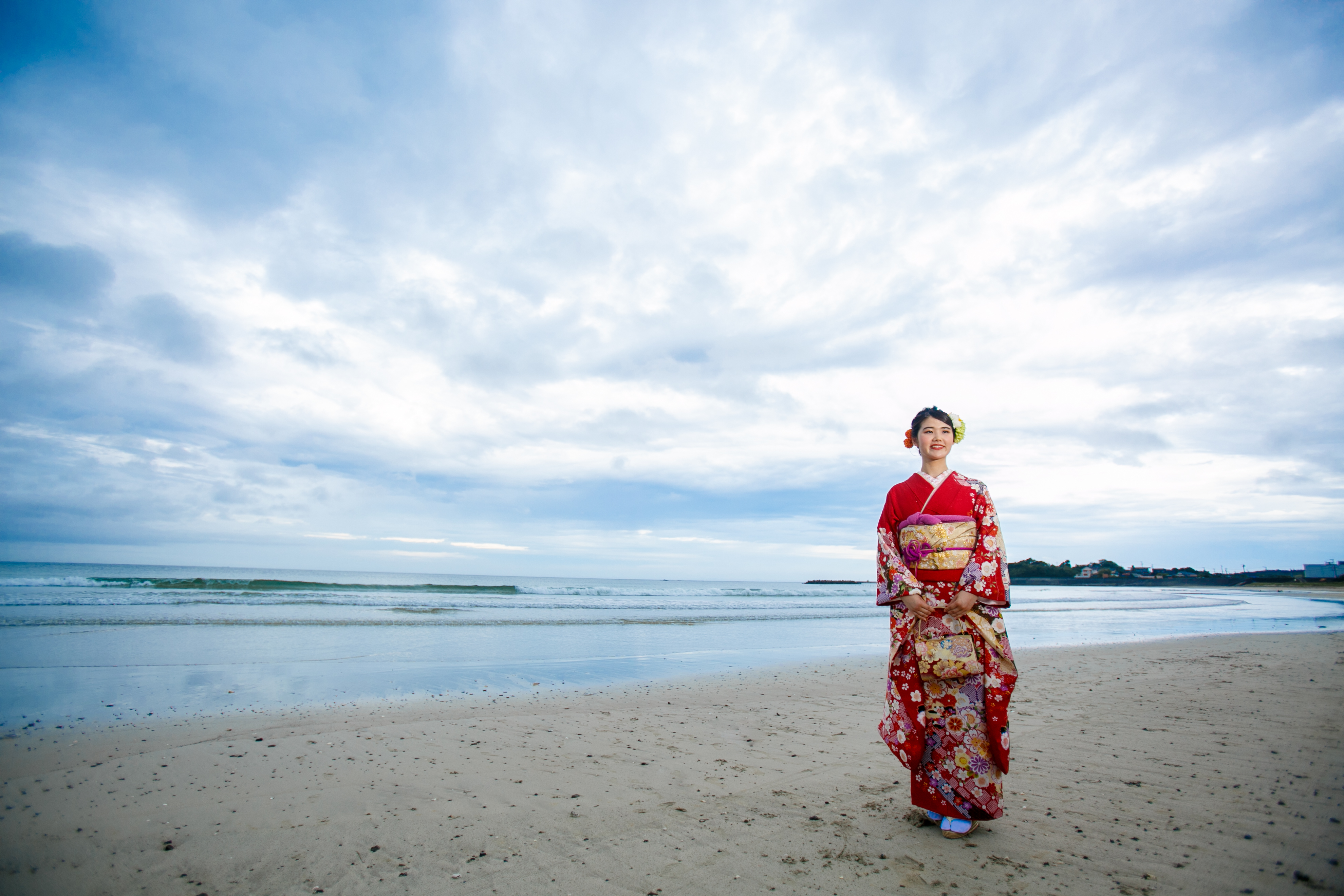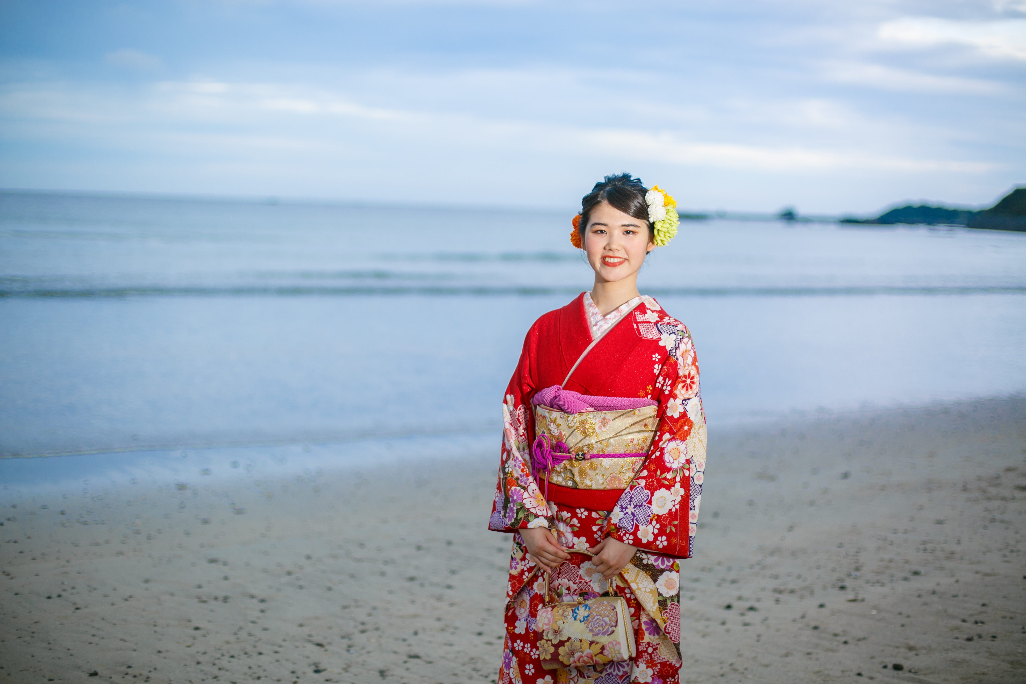 志摩に住むおばあちゃんが選んだという振袖で、まずは、スタジオで撮影したのち、ご実家のある国府へ移動し、ご実家の中や、近くの海岸でも撮影しました。