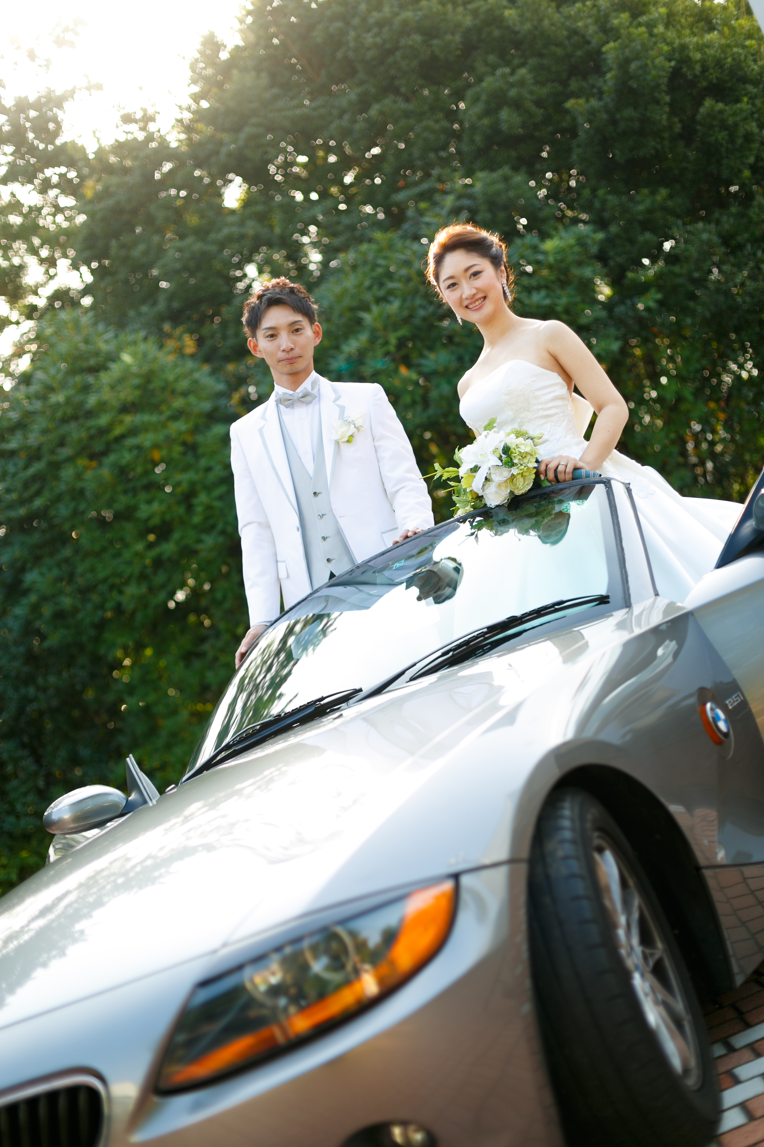 前撮りでは、長年、お父様から新郎様が乗ったオープンカーとともに撮影しました。